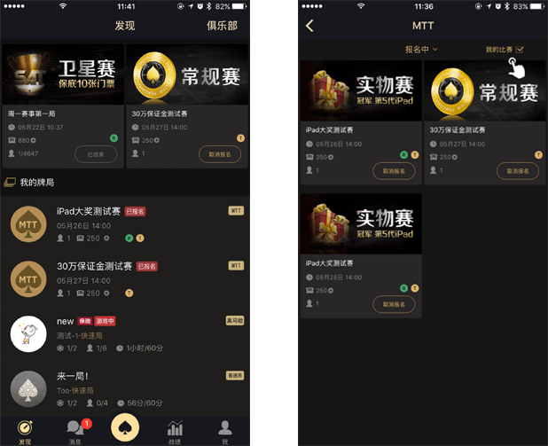 · 在发现页中的下方我的牌局中,玩家已报名未开始的赛事会置顶在列表最上方。