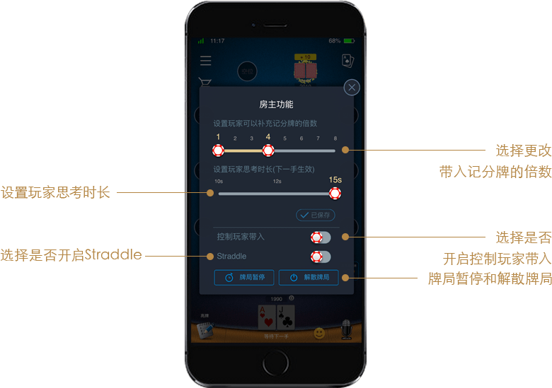 强制站起——使用此功能,在此轮手牌结束后,该玩家被强制站起,玩家申请再次加入牌局且经房主同意后,玩家仍可以继续坐下继续游戏。